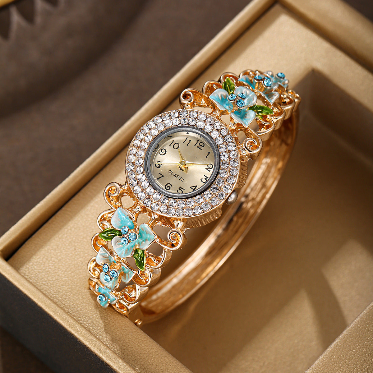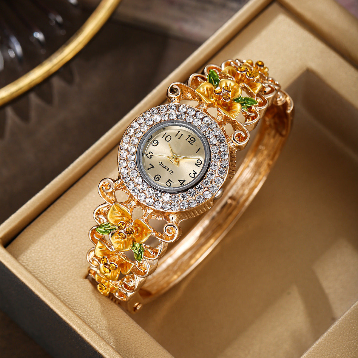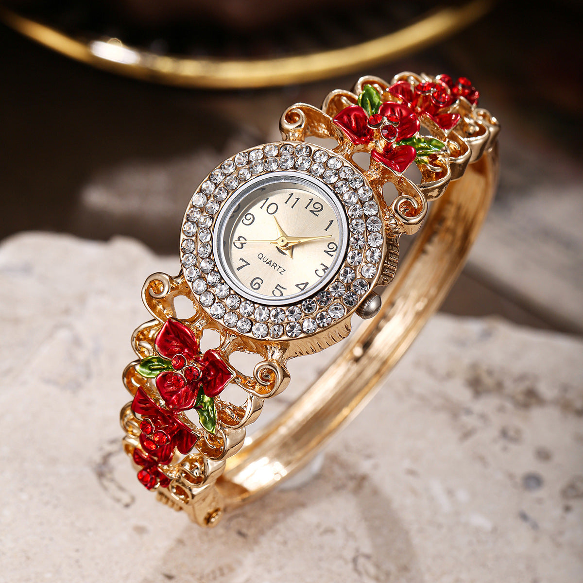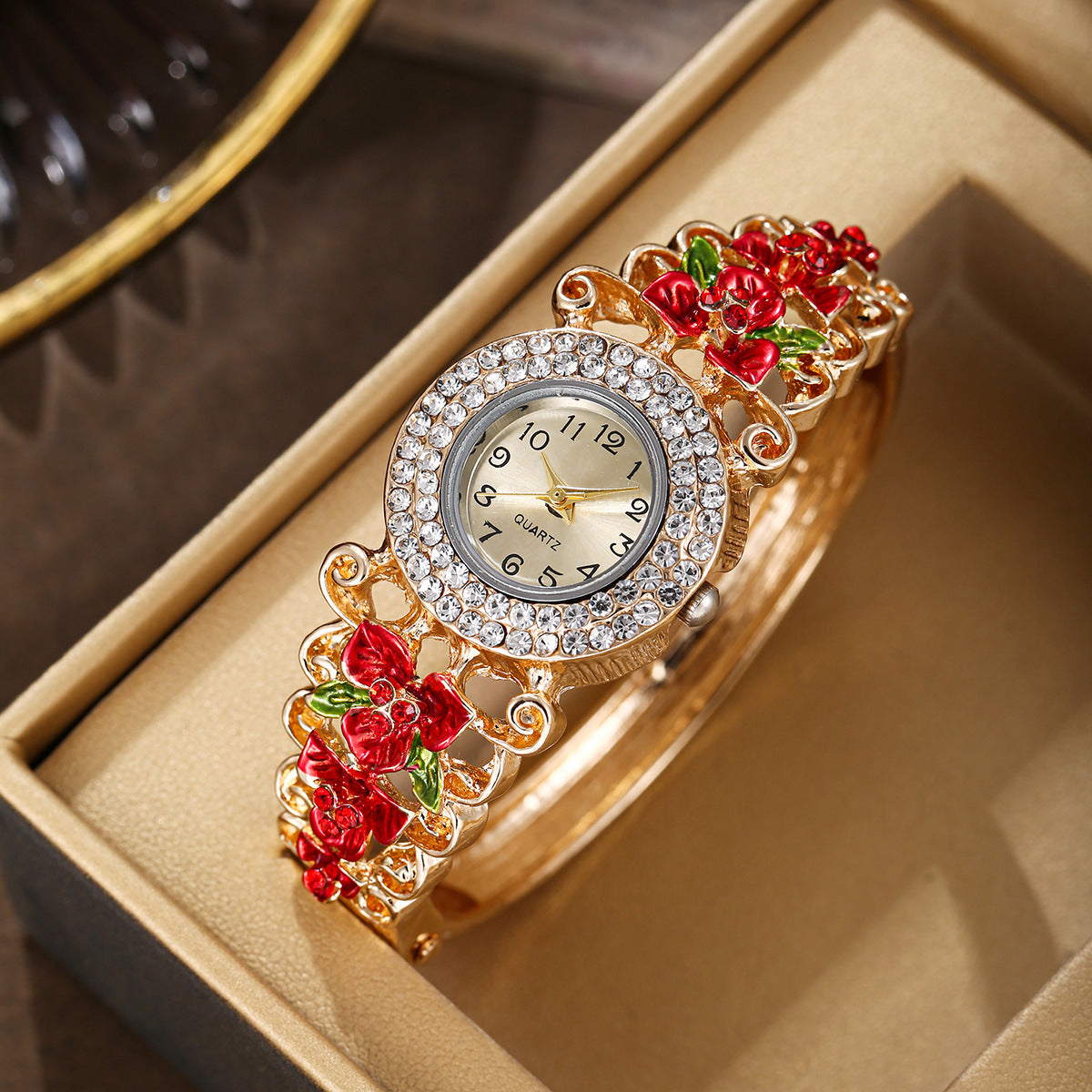 Shimmering stones, sculpted roses, and a golden cuff—this graceful timepiece brings a refined floral touch to your everyday looks.