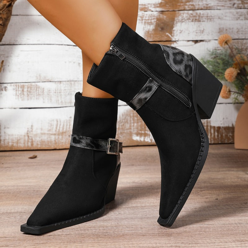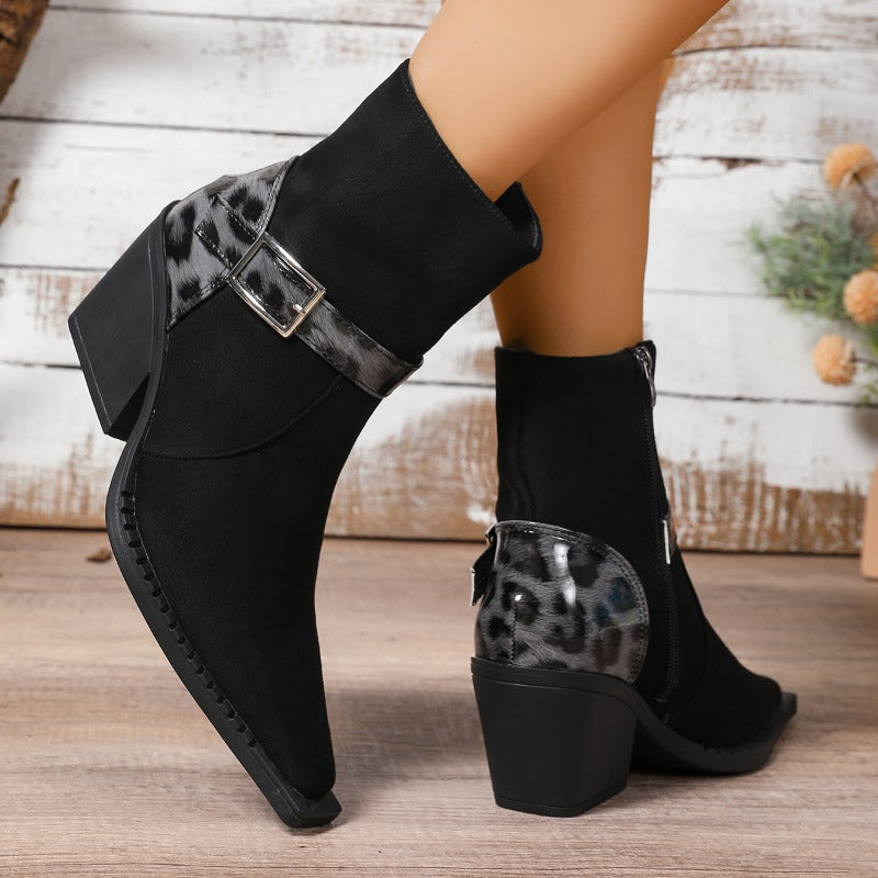 Wrap your stride in western charm with these pointed-toe boots, featuring a bold leopard-print strap and polished buckle for a modern, wild touch. Soft suede-like finish and a stable block heel make them perfect from day adventures to night outings.